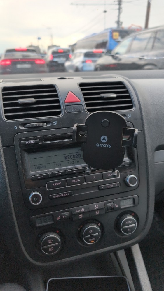 Держатель имеет автоматический зажим, подходящий для смартфонов с шириной экрана от 55 до 85 мм. Он закрывается автоматически при установке смартфона держатель. Смартфон нажимает корпусом встроенную на лицевой панели кнопку и захват смартфона закрывается. Чтобы вынуть смартфон из держателя, надо нажать две боковые кнопки и зажим откроется. Все это делается одной рукой, что очень удобно. Если экран смартфона широкий, на кнопки надеваются удлинительные колпачки.