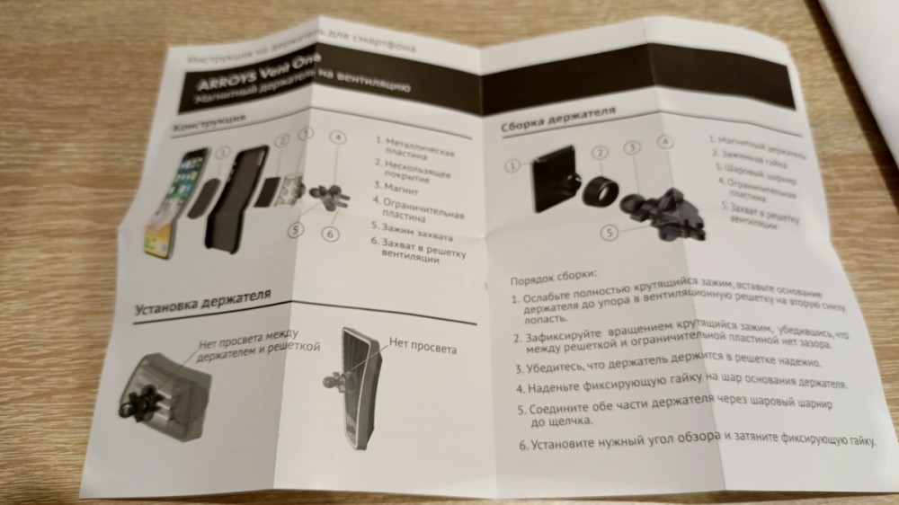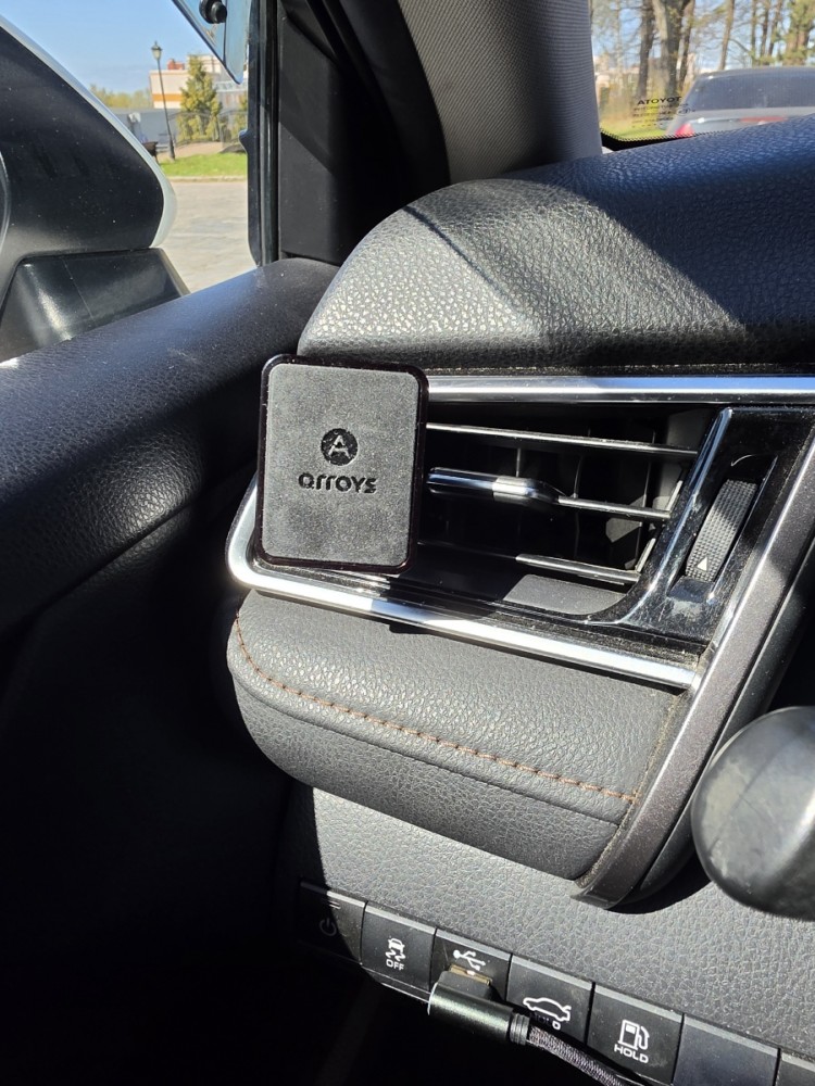 Само крепление на вентиляционную решетку - достаточно удобный способ, позволяющий разместить смартфон под рукой и с хорошим визуальным обзором. Чтобы горячий воздух из дефлектора не повредил смартфон, заслонку этой секции, как правило, перекрывают. Держатель устанавливается на вторую снизу лопасть решетки. При этом, он должен быть вставлен внутрь до конца, чтобы антивибрационная пластина уперлась в дефлектор. С помощью вращающегося "барашка" затягивается зажим крепления держателя в воздуховоде. В отличие от дешевых вариантов держателей в вентиляцию, которые крепятся только на упругости пластика, Arroys Vent One держится очень надежно и не вибрирует при езде. Он точно не вынется из решетки сам по себе, когда вы захотите снять телефон с магнитной "головы".