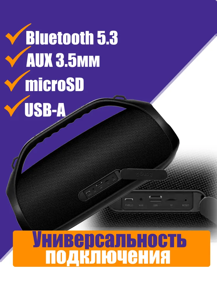 Tronsmart Bang 2 автоматически воспроизводит аудиофайлы с USB-флешки и карты памяти MicroSD при подключении с соответствующие порты. Для подключения аналоговых аудиоисточников предусмотрен вход AUX-in